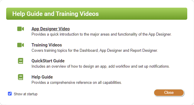 A Help Center dialog containing links to support documentation and how-to videos shows on the start up of the App or Report Designers by default. To turn off this default option, de-select the Show at Startup option on the Help Center dialog. If you turn off the Help Center but want to access it later, choose the Help Center option from the View menu.