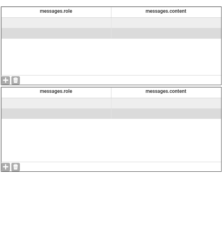The Table objects (7 above) should each have columns named "messages.role" & "messages.content". These two tables will serve as the data storage for the interaction between the user and the AI chatbot. The data will be stored in these respective tables as "users send messages" and "receive responses".