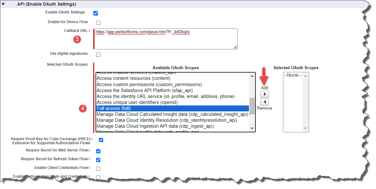 4. In the Selected OAuth Scopes section, scroll down, select and add the Full access (full) option.