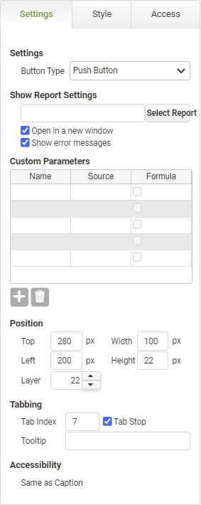 Click the Select button to display the Select a Report dialog. Here you can choose from any of your published private or shared reports to determine which app will be launched when the button is clicked. Once the report is selected, the report name will display in the read-only field to the left of the Select button on the Properties panel.