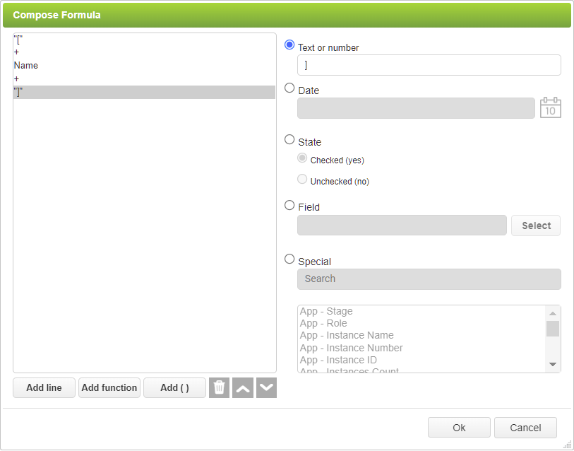The '[' are literal characters entered in the Text or number field. The Name field is selected from the Field option.